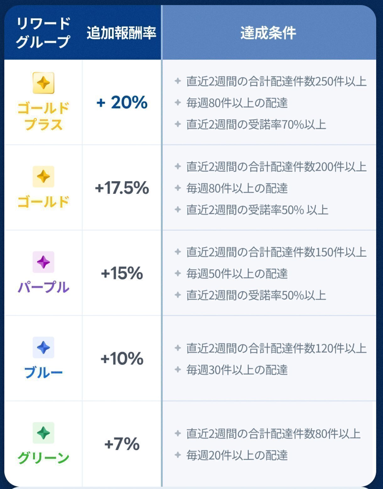 これはロケットナウの配達を頑張れば頑張るほど、その後の配達の報酬がアップするという制度。