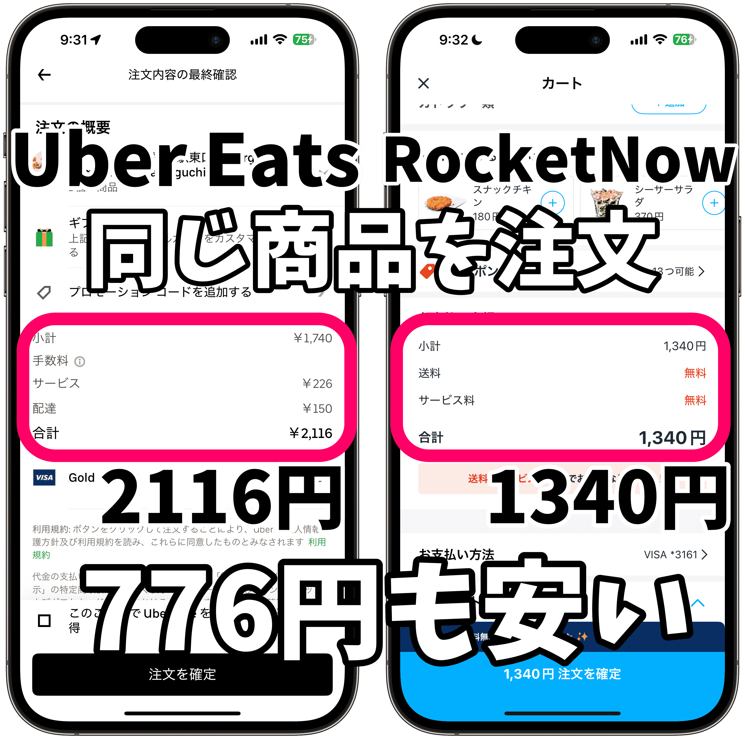 ウーバーイーツとロケットナウで、バーガーキングの「ダブルチーズワッパーセット」を注文したところ、商品価格の差に加えて送料無料、サービス料無料で合計776円の大きな価格差が出ました。