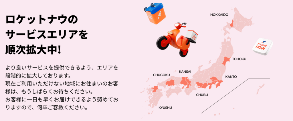 2025年1月に東京都港区でサービスを開始したロケットナウは、とてつもない勢いでエリアを拡大し、現在全国の主要な地方中枢都市全てでサービスを行っています。