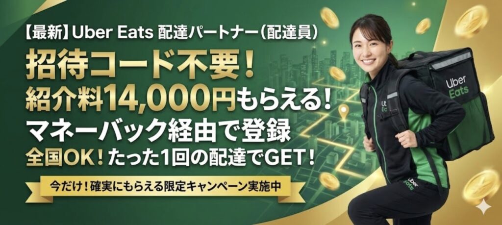 ウーバーイーツ配達員にまだ登録していない方は、特別なサービス経由で登録すると一回配達するだけで14000円ももらえますよ!