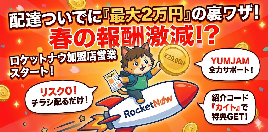 本記事では、ロケットナウ配達員の登録方法、紹介コードを使った4,000円ボーナス、実際にどれくらい稼げるのか、口コミ・評判、メリット・デメリット までをわかりやすくまとめました。