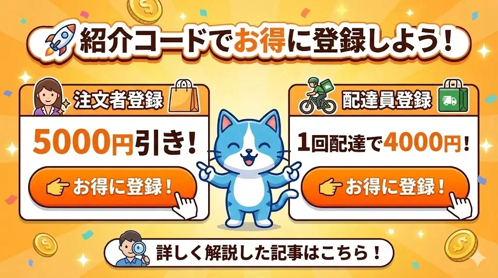 - 紹介コード入力で登録後、初回配達完了で追加2000円ボーナス