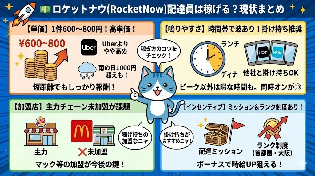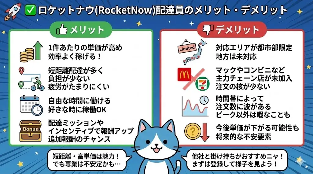ロケットナウは、短距離・高単価で効率よく稼げるのが魅力です。一方で都市部限定であることや、注文数に波がある点は注意が必要です。