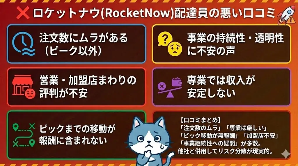 悪い口コミでは、「注文数のムラ」「専業では厳しい」「報酬に含まれない移動距離」「加盟店周りの不安」「事業継続性への疑問」が多く挙がっていました。とくにサービス初期は注文量が安定しにくいため、他社と併用してリスク分散しながら稼働する人が多いのが実情です。