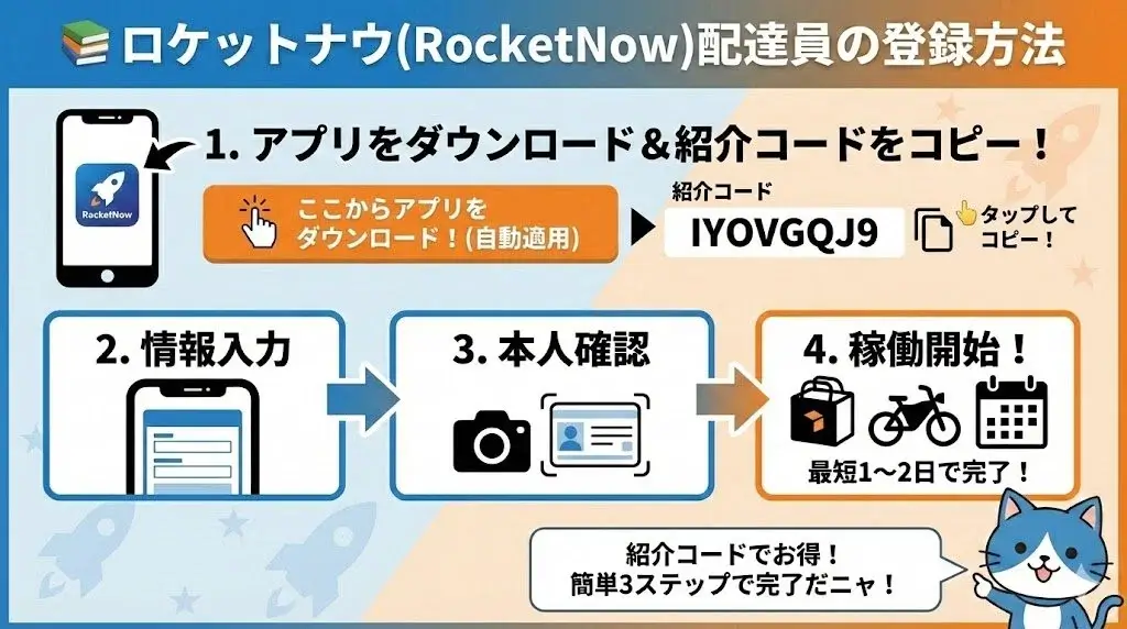 ロケットナウ配達員になるための登録手順は以下の通りです。